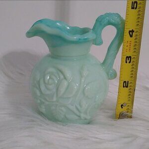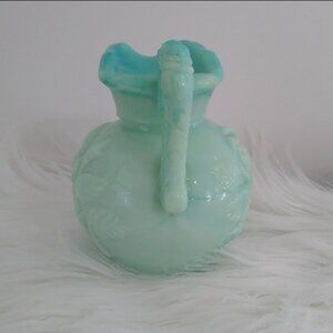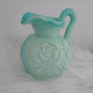 1970's Vintage Avon Victoriana Rose Embossed Marbled Aqua Jadeite Glass Bath Oil Pitcher/Cruet.