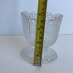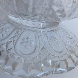 Cute vintage Avon bathroom apothecary clear glass footed dish w scallops. Daisy floral pattern.