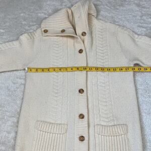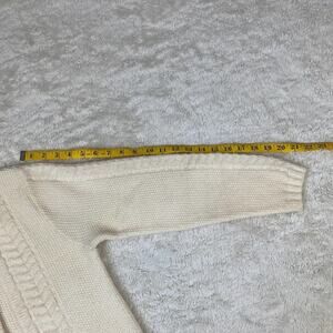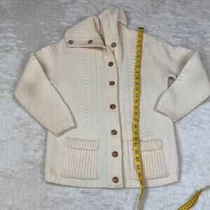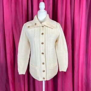 Vintage cardigan by Avon Fashions in cream. Features a turnover collar and wood buttons. Pockets in front, and a cable sweater design.