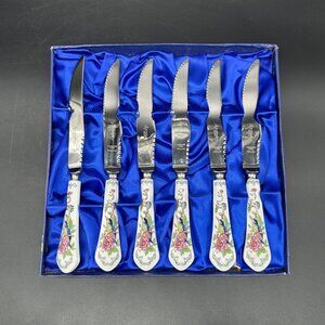Vintage Aynsley Pembroke Fine Bone China Stainless Steel Steak Knives Bird Pink