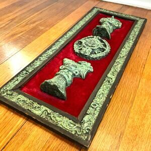 Vintage Aztec Crushed Malachite Over Red Velvet Folk Art Hanging Wall Plaque