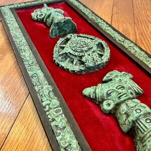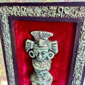 This striking vintage wall plaque features three detailed Aztec characters crafted with crushed malachite, set against a rich red velvet background. A crushed malachite border frames the piece, adding vibrant texture and depth. The folk art design captures bold imagery and intricate craftsmanship, bringing a dramatic and unique touch to any space. The plaque measures approximately 18 inches in height and 9 inches in length. A beautiful piece of vintage craftsmanship, perfect for adding character to your decor. In very good vintage condition with minor signs of age-appropriate wear.
