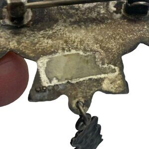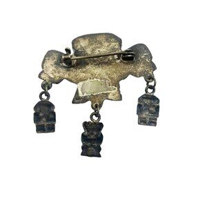 Pre-columbian style / Aztec Inca style silver jewelry, vintage brooch with little tiny mask tassels, hallmark for 900 silver, tested.