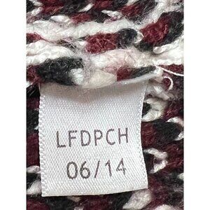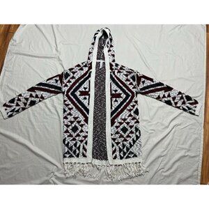 This vintage-inspired Aztec knit hooded cardigan is stylish and cozy. With a fringe trim and boho style, it offers a unique and comfortable fit.