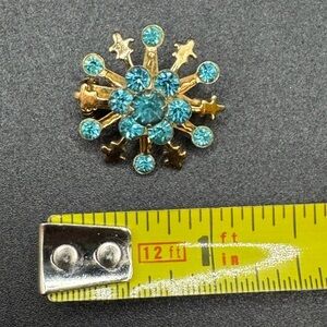 Vintage AZURE “SNOWFLAKE" Pin FROM 1949. GOLDTONE SETTING WITH AQUA (AZURE) RHINESTONES. ABOUT 1" IN DIAMETER. VERY GOOD CONDITION. NOT MARKED.