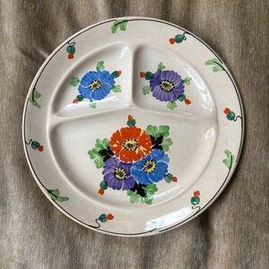 Enhance your dining experience with this charming floral ceramic divided plate. Featuring vibrant blue, orange, and purple flowers, this plate adds a touch of elegance to any table setting. Perfect for serving a variety of dishes while keeping them separate. Made in England. Plate is in very good used condition.