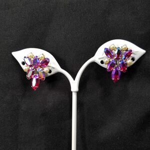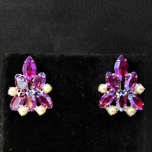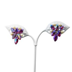 Vintage B. David Aurora Borealis Red Rhinestone & Faux Pearl Clip Earrings 1960s