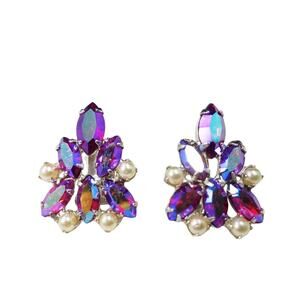 This is a beautiful pair of vintage B. David clip-on earrings from the 1960s, featuring marquise-cut red aurora borealis rhinestones accented with round faux pearls on a silver-tone setting. The AB finish gives the rhinestones a captivating shimmer of purples, blues, and reds when they catch the light. These earrings are light in weight and designed with B. David’s signature quality and attention to detail. Perfect for a special occasion or to add a glamorous vintage touch to any outfit. These earrings would make a wonderful gift or an elegant addition to your vintage jewelry collection.