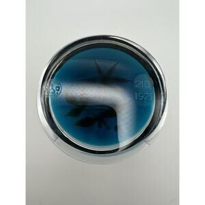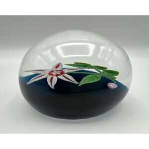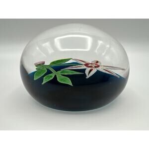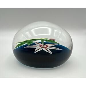 Gorgeous vintage 1971 Baccarat white & pink flower lampwork paperweight with a blue base. Paperweight measures approximately 2.25” tall and 3” wide. Good condition, no chips or cracks. There are some light scratches (see photos).