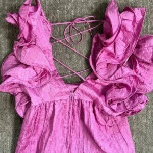 Exaggerated ruffle sleeves, belted waist, lace back, v neck