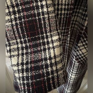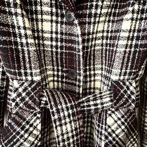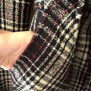 This vintage BCBG Max Azria coat features a classic, belted silhouette with a rich plaid pattern in black, white, and hints of red, giving it a timeless and sophisticated look.