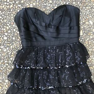 Super cute and sassy BCBG tiered ruffled mini dress with sequin layers and sheer overlays. Condition is perfect. MRked size 2. Bust measures 29 inches. Waist 25 and length 27 inches from top of bust.