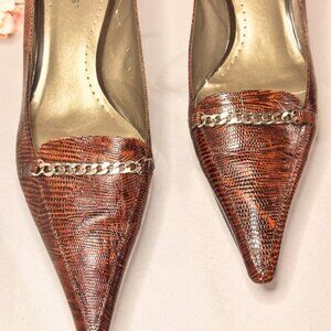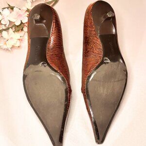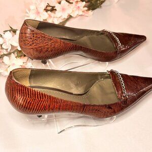 A classic with an extreme pointed toe. This low heel pump is great for us girls who need a little bit of height but aren't feeling like wearing a full on pair of high heels somedays. This is a vintage pair of shoes. However, they are in great shape and still beautiful. Please see photos for their "adventure marks".