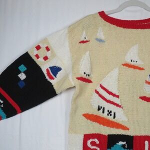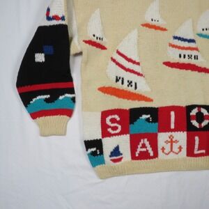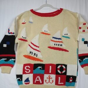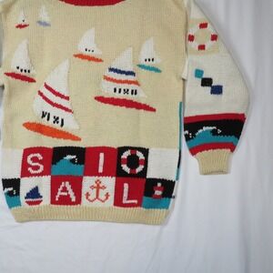 Set sail in style with this eye-catching vintage knit sweater! A whimsical nautical scene unfolds across this cozy pullover, featuring charming sailboat motifs dancing across a creamy beige backdrop. The playful design continues with colorful blocks spelling out "SAIL" and "AHOY", complete with nautical icons like anchors, life preservers, and waves. Bold black and white sleeves add a touch of contrast, while the red-trimmed neckline provides a pop of color. This sweater is perfect for adding a touch of fun and nostalgia to your wardrobe. Imagine wearing it on a breezy day at the beach, a casual weekend brunch, or a cozy evening by the fireplace.