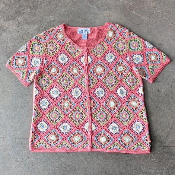Vintage BFA Classics Pink Crochet Granny Square Short Sleeve Cardigan Sweater
