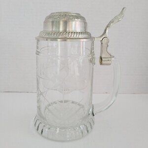 Vintage BFM-N West Germany Etched Crystal Clear Glass Beer Stein Pewter Lid