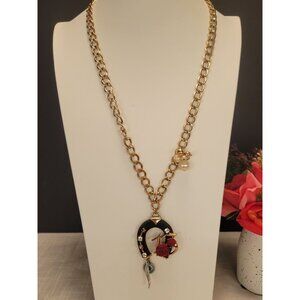 Vintage BJ Betsey Johnson Charm Necklace W/ Horseshoe & Rose Pendant 24"