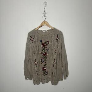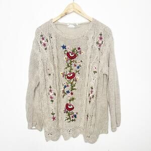 Vintage BOBBIE BROOKS Floral Embroidered Sweater Tan Pearl Embelished L XL