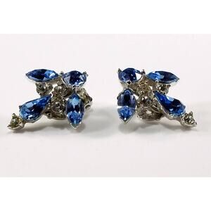 *Description: This is a beautiful vintage pair of Bogoff earrings featuring blue rhinestones. These earrings, dating back to the 1940s-1950s, are clip-on style and have a floral design with a rhodium-plated base. The earrings incorporate faceted navette and chaton-cut rhinestones in sapphire blue and clear colors. The maker's mark, "Bogoff," is visible on the earrings.