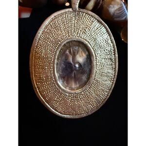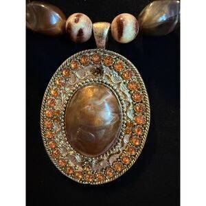 Pendant: The pendant is a large, oval-shaped piece with a brownish, translucent stone at its center. This central stone is surrounded by a metallic border decorated with smaller, reddish-orange gems.