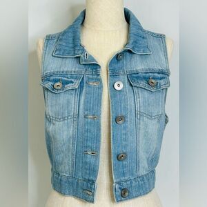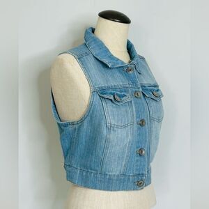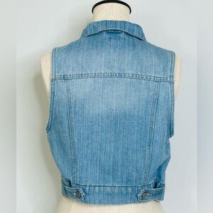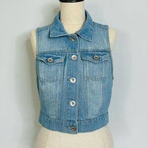 Light rinse on this cropped denim vest by Bongo. 2 front button pockets, buttons at back waist to adjust and make tighter or looser fit. Approx 18” across PTP and 16” shoulder to hem. Gently used, no flaws.