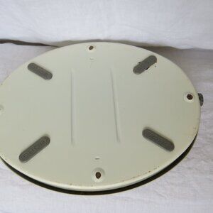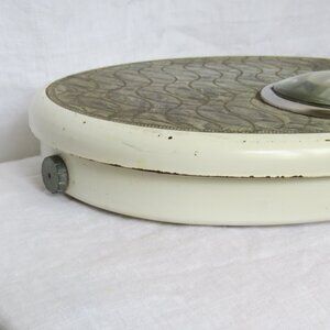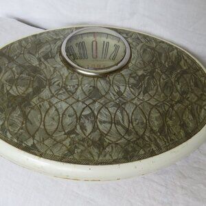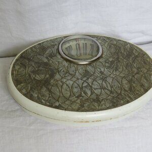 This is a fabulous vintage metal scale with a cream/off white colored base and gray marble style quilted vinyl on the top. It has a dial under the glass at the top that reaches up to 300 pounds. The scale works smoothly. There is a dial at the side to zero it out. It is a heavy-duty scale. Overall good condition, but there is visible wear and rusting. This is a vintage item, please see all pictures for details.