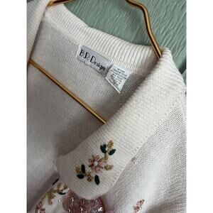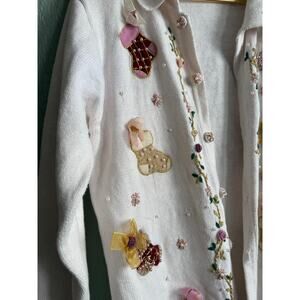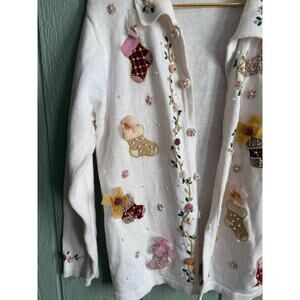Absolutely charming vintage holiday sweater by B.P. Design. Features 3D embroidered stockings, velvet appliqués, pearl beading, floral embroidery, and sweet ribbon bows throughout. Gorgeous detail front & back — this one is perfect for holiday parties, festive photos, or anyone who loves whimsical vintage Christmas sweaters.