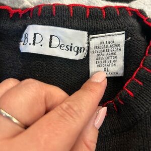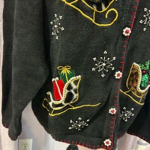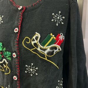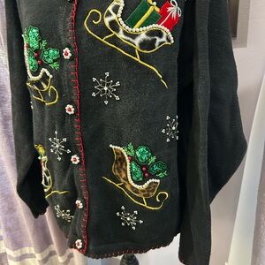 A unique twist on a holiday cardigan. Embroidery detailing at the sleighs and holly leaves, with animal print patches in the sleighs. Faux beaded buttons down the front. Actual button closure is hidden. Red stitching detail along hems. Vintage, sweater portion is worn but has a lot of life left. Perfect for a holiday office party!