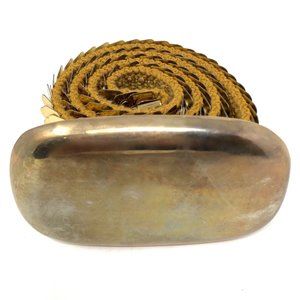 This 1980s vintage elastic belt is brass and features a fish scale pattern, with a large and heavy brass belt buckle. This has quite a bit of stretch to it, so it will fit a variety of body sizes. This would look great over a t-shirt dress.