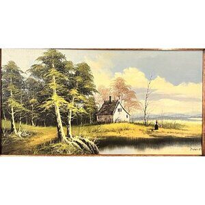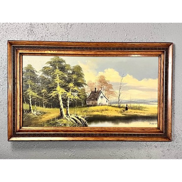 The 1970s oil painting is a landscape by an artist named Brenner. It depicts a rustic cabin by a body of water with a figure nearby. Perfect for anyone with a European style decor or a Maximalist aesthetic.