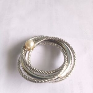 This vintage brooch features a silver tone interlocking open circle design with a faux pearl accent, making it a stunning accessory for all occasions. The retro 1980's era piece exudes beauty and artistry, perfect for adding a touch of elegance to any outfit. Signed or not signed, this fashion-forward brooch captures the essence of vintage glamor with its unique design and timeless appeal.