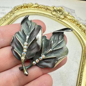 Vintage BSK Brushed Enamel & Rhinestone Leaves Leaf Brooch Moss Green Enamel