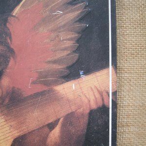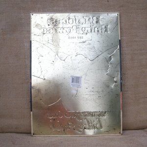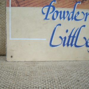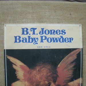 Vintage B.T. Jones Baby Powder metal sign. Has an angel with a lute artwork. Printed front, gold color back. From World Bazaars. 4 holes at corners for hanging. Says "B.T. Jones Baby Powder Est. 1912" at top. Bottom says "Powder for our little angels". 16 5/8 inches high, 12 inches wide. Good vintage ondition: has dirt & scratches/marks /scrapes on front from age/use. Back has scratches/scrapes/ finish wear. See photos. Great for retro decor or as part of a collection. Great for a bathroom.