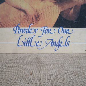 tags: sign, metal, baby powder, angel, lute, artwork, advertising, ad, product sign, BT Jones, vintage, decor, display, collectible