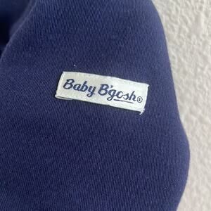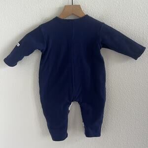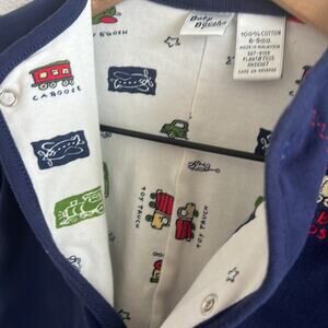 Vintage Baby B'Gosh 100% Combed Cotton Commuter Transportation Snap Button Onsie. Long sleeve, full legs. Full snap button opening. The outer is solid blue with inner transportation print,.