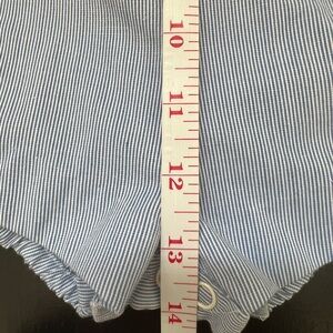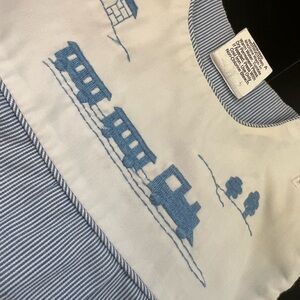 Adorable baby blue striped romper with train embroidery. Perfect for a cute and comfy look.