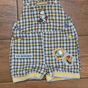 Vintage Baby Boy Overalls 6-9M Blue Yellow Plaid Lil Builder Construction Theme