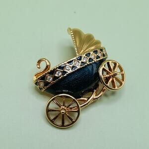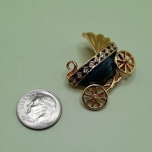 Description: This is a vintage brooch shaped like a baby carriage. This brooch features a dark green body, gold-tone accents, and clear rhinestone detailing along the upper edge. The wheels and the retractable hood are also gold-toned, adding to the vintage aesthetic. Brooches like this were popular in the mid-20th century and are often collected as vintage jewelry pieces. This brooch is stamped with the hallmark: mla. This would be a great addition to your jewelry collection or make a great gift!