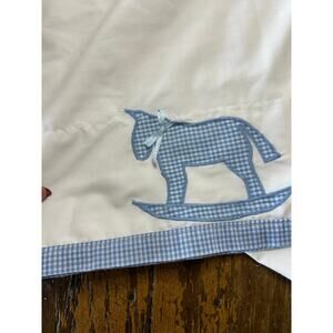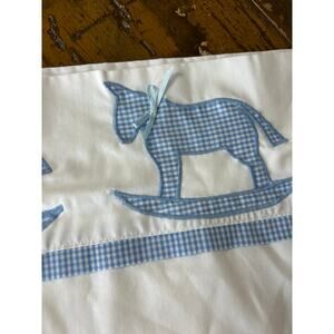 Charming vintage baby bedding set featuring blue gingham rocking horse appliqué with ribbon bow accents. White cotton blend fabric with coordinating gingham trim. Includes crib sheet and matching pillowcase. Sweet mid-century/retro style, perfect for a vintage-inspired nursery or collector.
