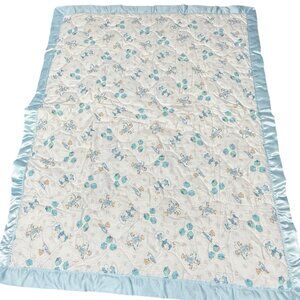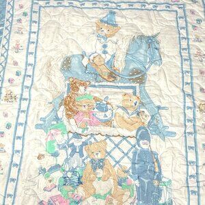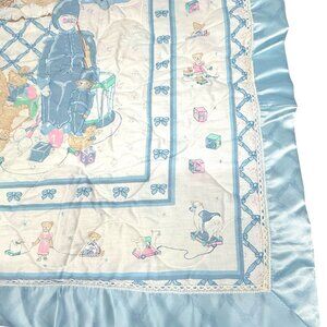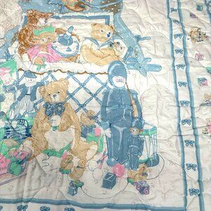 Vintage Baby Crib Quilt Blue Teddy Bears & Toys Reversible Stain Trim Nursery