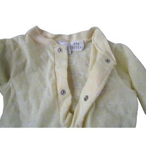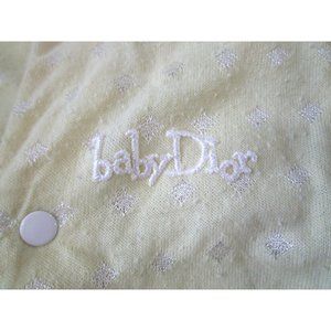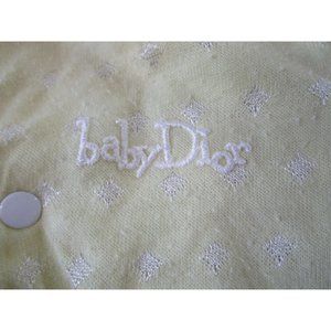 Charming vintage Baby Dior layette in yellow and white. Features include fold over cuffs that form mittens, white grosgrain drawstring bottom, and embroidered baby Dior insignia at left breast. Rib knit collar and two snap closure provide ease and comfort. Fits up to 13lbs. Made in the USA.