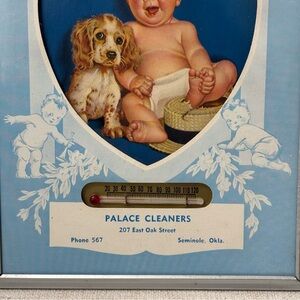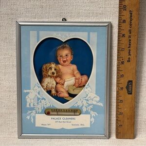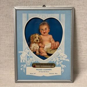 Vintage Baby & Dog Framed Thermometer Picture 1930s to 1950s Wall Hanging