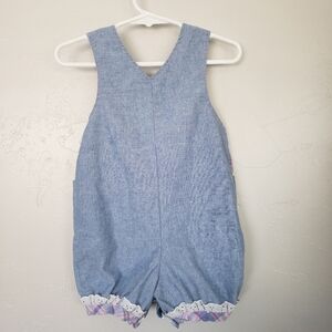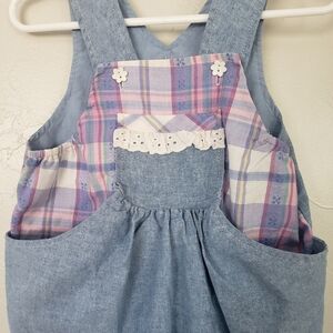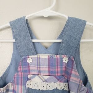 Vintage Baby Girl 18 Months Light Blue Denim Romper Plaid Eyelet Lace 90s