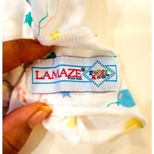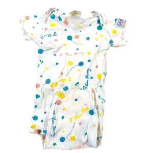 1 white short sleeve onesie with colorful balloon and star print, marked “Made in USA”