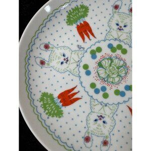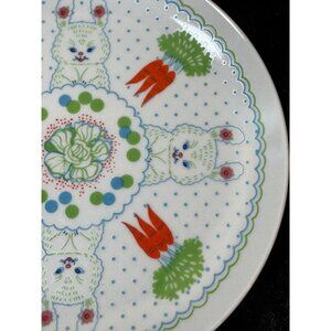This ceramic plate showcases a playful bunny and carrot design with intricate detail, making it a charming addition to any collection or display.