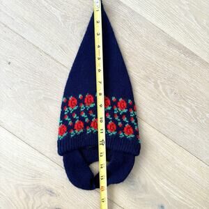 Vintage Baby Navy Blue Red Rose Print Knit Winter Elf Hat Size 0-6 Mo. this sweet little hat is in great preowned condition. There is no pop Pom but I don't know that there ever was! It would make a great gift for the holidays.
