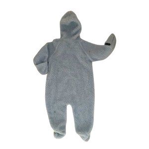Vintage Baby One Piece features two zipper closures for easy dress. Rare vintage onesie with bear detailing in front. Cute and cozy one piece that will keep your baby warm. Has hoodie to keep head warm with cute teddy ears on top. Muffin closure for hands and also has opening that's optional. Footies at bottom. Has age but kept with care, Comes in a pastel blue and white color. Brand by Happy Kids. Size 0/6 mos.