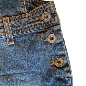Features: Adjustable straps, side button closure, snap-button leg details, front bib pocket, flare bottoms