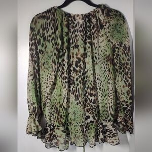 Elevate your style with this chic leopard print blouse. Featuring a blend of green and brown, this top is perfect for any occasion. The lightweight fabric ensures comfort and elegance.