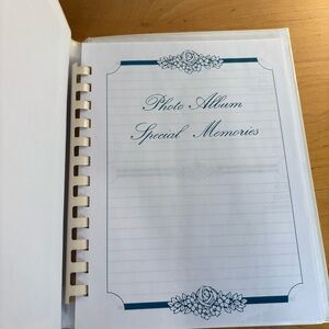 Vintage album in new condition. Inside has sheets for writing notes and plastic slots for pictures.